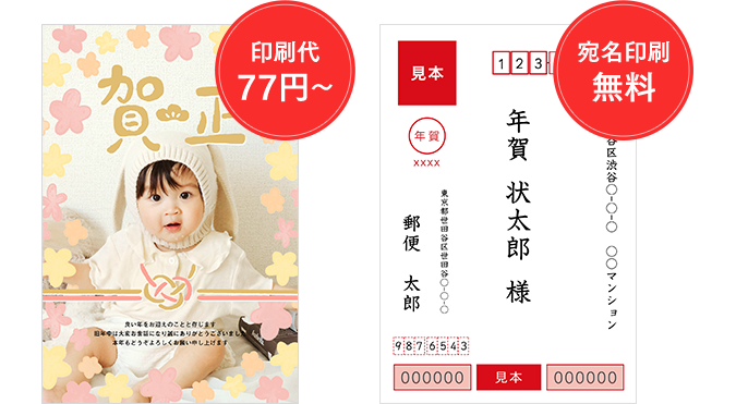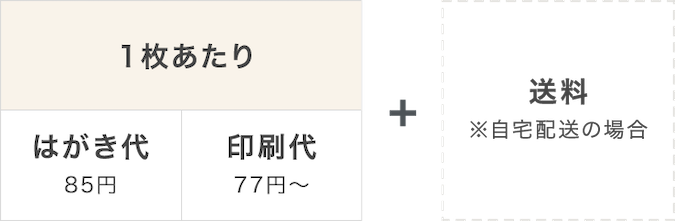 はがき代は1枚85円(税込)です。切手代は必要ありません。日本郵便が発行する各種はがきに印刷いたします。